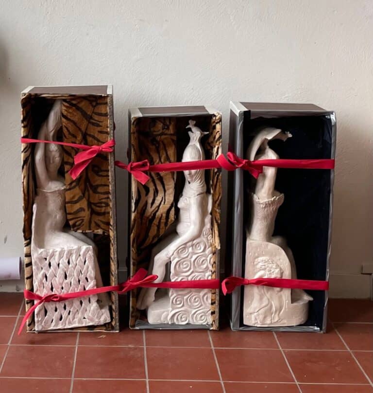 Transportkisten voor de Dames beelden. Met zacht velour bekleed. Er komen witte handschoentjes bij om de beelden eruit te halen. Nog 6 kisten maken en dan de deksel erop.